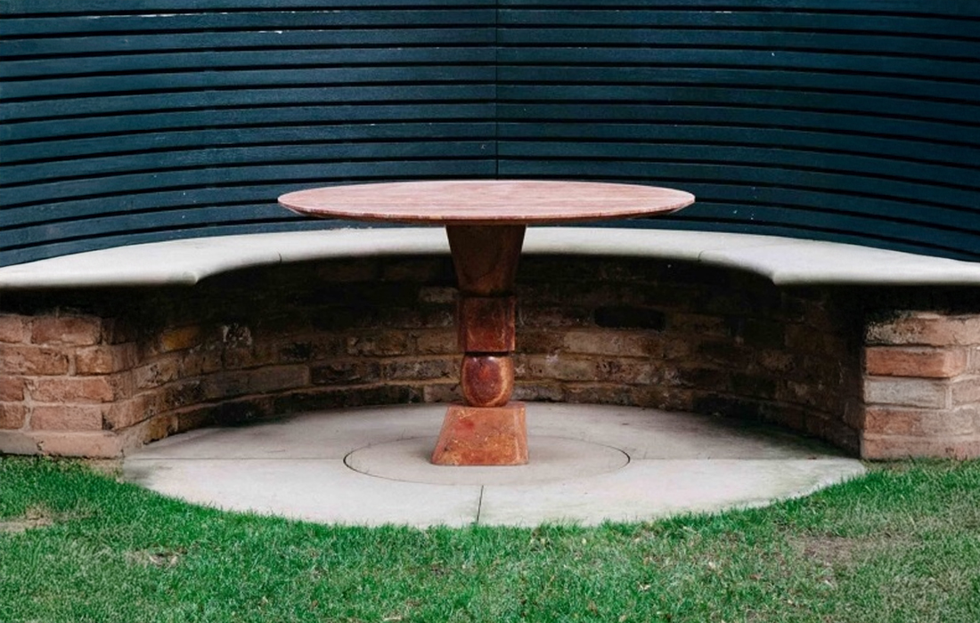 Totem is a round table carved in travertino. It is supported on a slender pillar consisting of strong, yet plastic, geometric volumes.